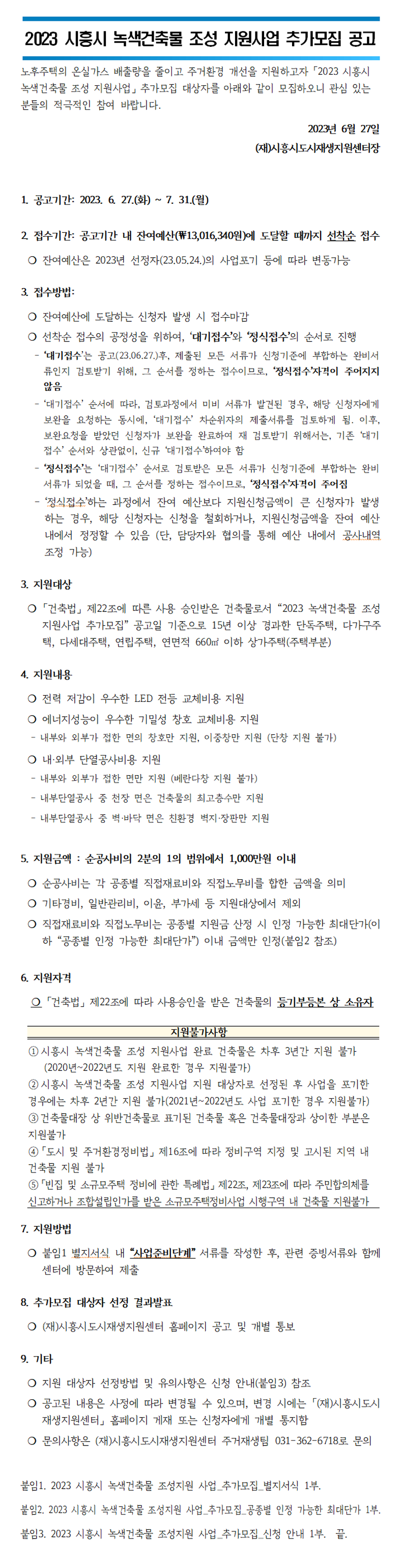 녹색건축물 조성 지원사업 공고 녹색건축물 조성 지원사업 공고 본문내용 작성자 : 시흥시도시재생지원센터 작성일 : 2023.08.02 조회 : 1738 첨부파일 목록 첨부파일 [공고] 2023 시흥시 녹색건축물 조성 지원사업_추가모집.hwp (붙임1) 2023 시흥시 녹색건축물 조성지원 사업 추가모집_별지서식.hwp (붙임2) 2023 시흥시 녹색건축물 조성 지원사업_추가모집_공종별 인정 가능한 최대단가.hwp (붙임3) 2023 시흥시 녹색건축물 조성 지원사업_추가모집_신청안내.hwp 목록