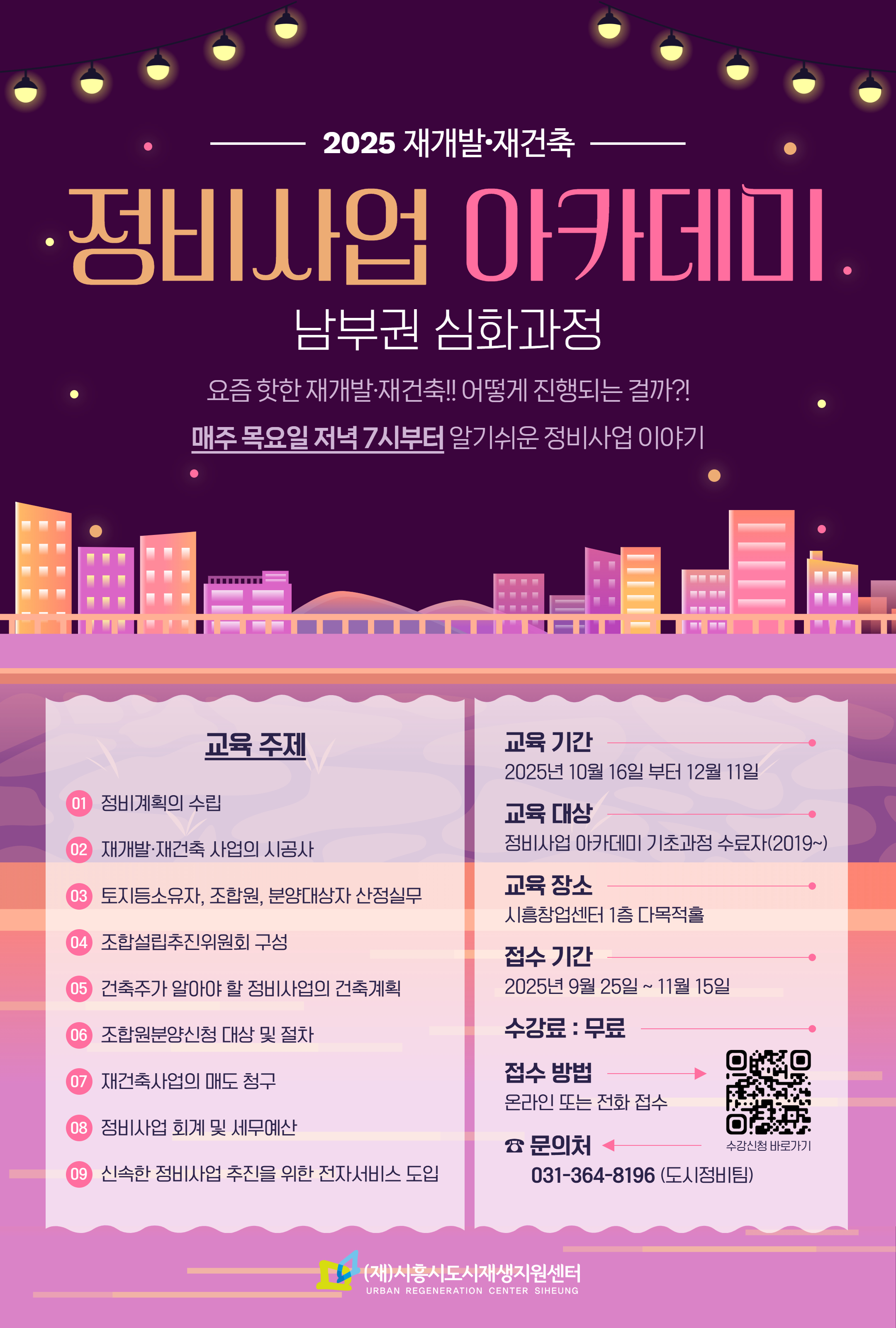 [모집] 정비사업 아카데미(남부) 심화과정 수강생 모집 [모집] 정비사업 아카데미(남부) 심화과정 수강생 모집 본문내용 작성자 : 도시정비팀 작성일 : 2025.10.15 조회 : 137 첨부파일 목록 첨부파일 홈페이지 상단 (교육소개/신청) → (교육/공모신청) → (2025 정비사업 아카데미(남부) 심화과정) 클릭 전화접수도 가능하니 아래번호로 문의주시기 바랍니다. ☎️ 문의 : 031-364-8196 (도시정비팀 김주희 책임) 목록