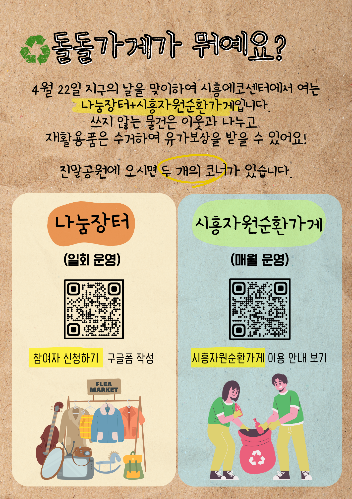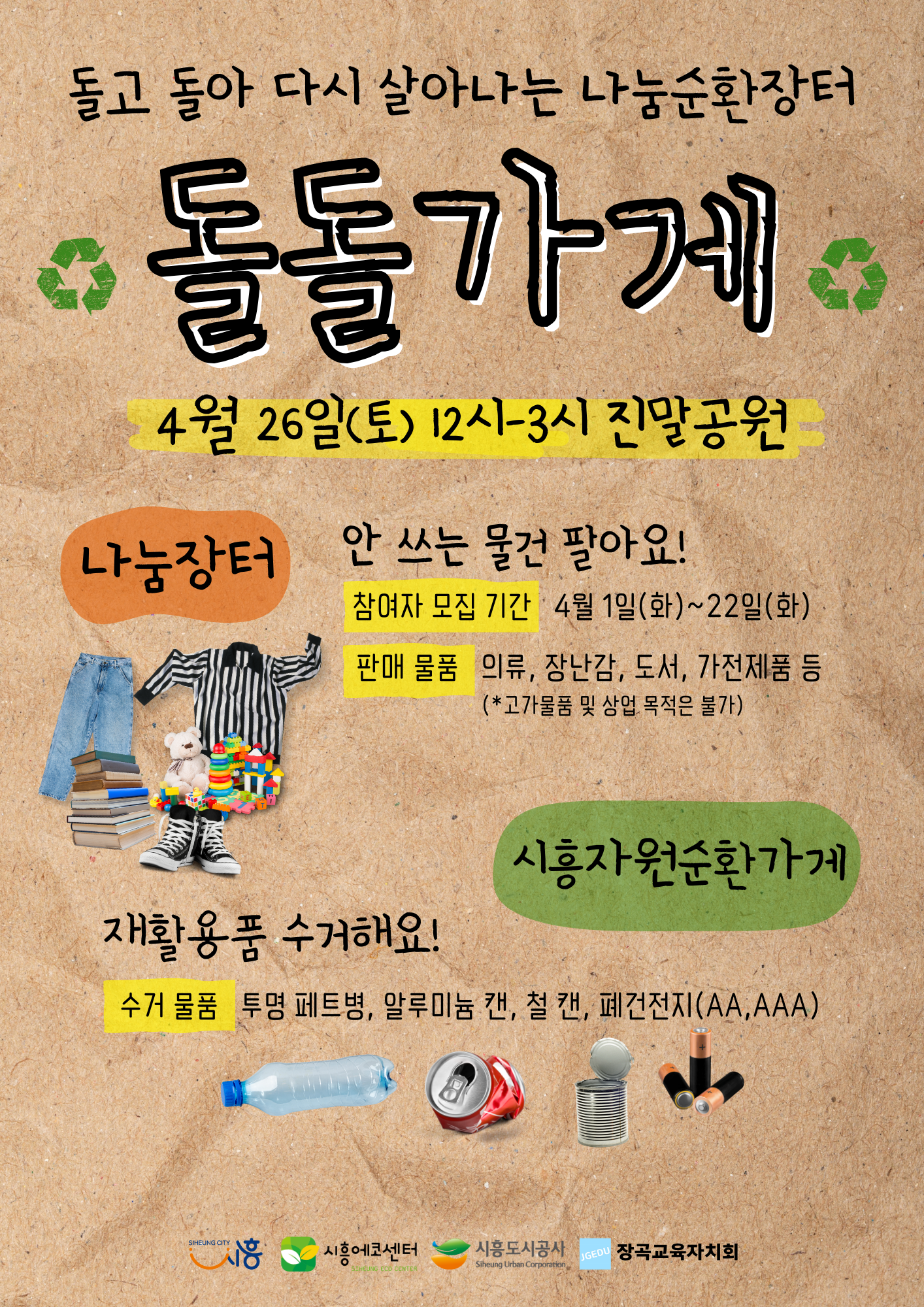 기후변화주간 기념 시흥에코센터 나눔장터 '돌돌가게' 참여자 모집 기후변화주간 기념 시흥에코센터 나눔장터 '돌돌가게' 참여자 모집 본문내용 작성자 : 시흥시도시재생지원센터 작성일 : 2025.04.01 조회 : 756 첨부파일 목록 첨부파일 목록