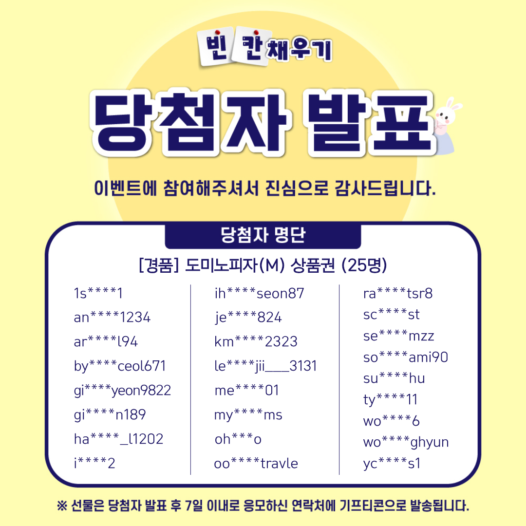당첨자 발표! [시흥시 기관들과 함께하는 두번째 릴레이 이벤트] 이벤트에 참여해주신 모든 분들께 진심으로 감사드립니다. 기관 릴레이 이벤트 빈칸 채우기 퀴즈의 정답과 당첨자를 발표합니다! ►문제 정답발표! * 시흥도시공사 - 든든 * 시흥산업진흥원 - 애로 * 시흥시청소년재단 - YOUTH * 시흥시인재양성재단 - 배움 <<경품 안내>> 도미노피자(M) 상품권 (25명 추첨) 선물은 당첨자 발표 후 7일 이내로 응모하신 연락처에 기프티콘으로 발송됩니다. 시흥시 기관 릴레이는 앞으로도 계속됩니다! 많은 관심과 참여 부탁드려요~! #시흥시 #시흥시홍보거버넌스 #릴레이이벤트 #빈칸채우기이벤트 #시흥도시공사 #시흥산업진흥원 #시흥시청소년재단 #시흥시인재양성재단 ![]() ![]() |