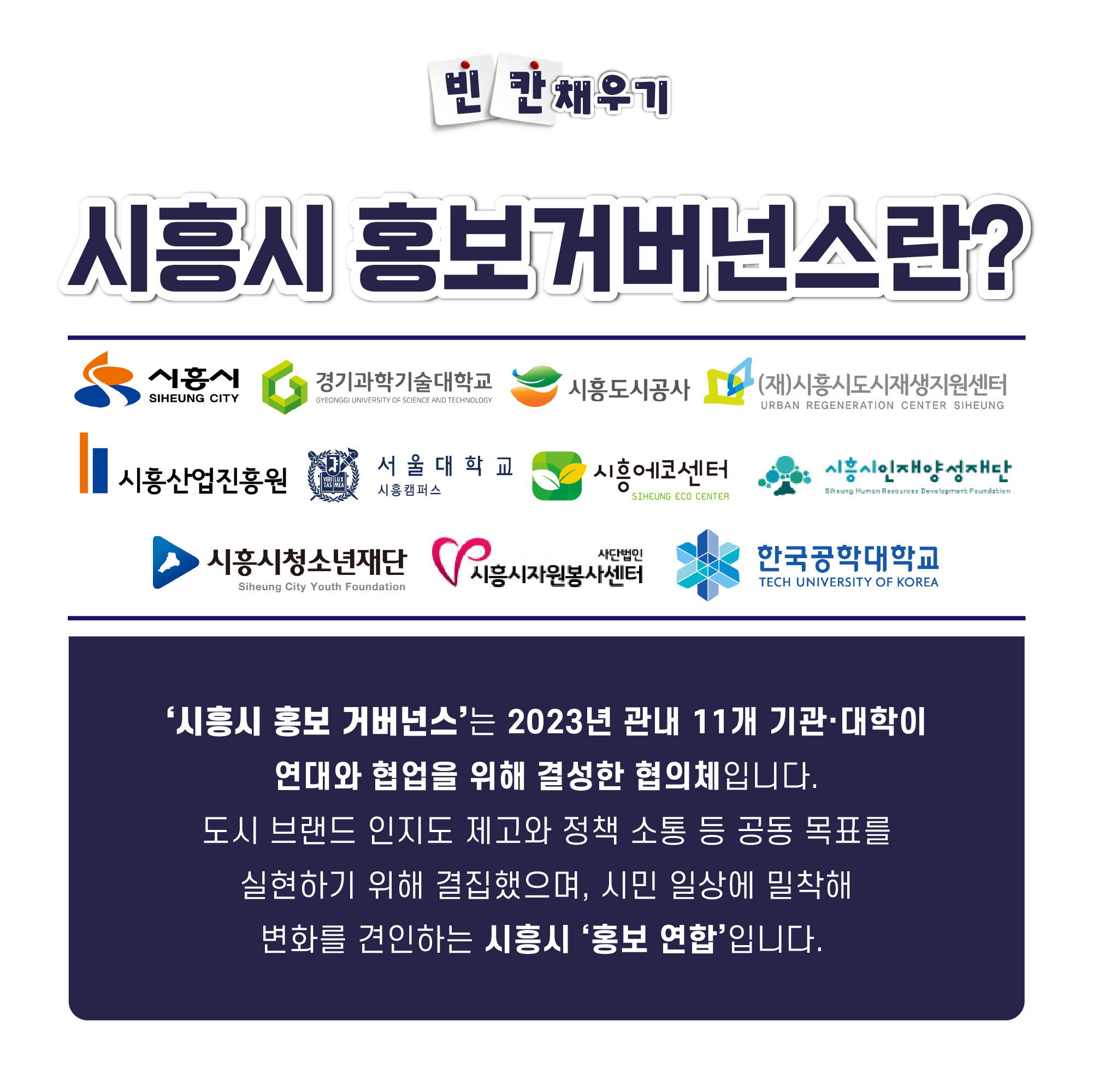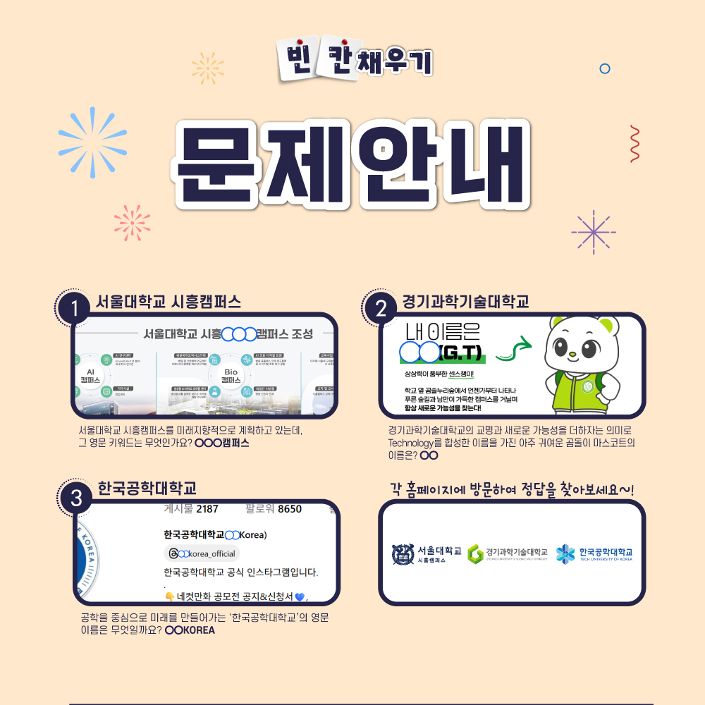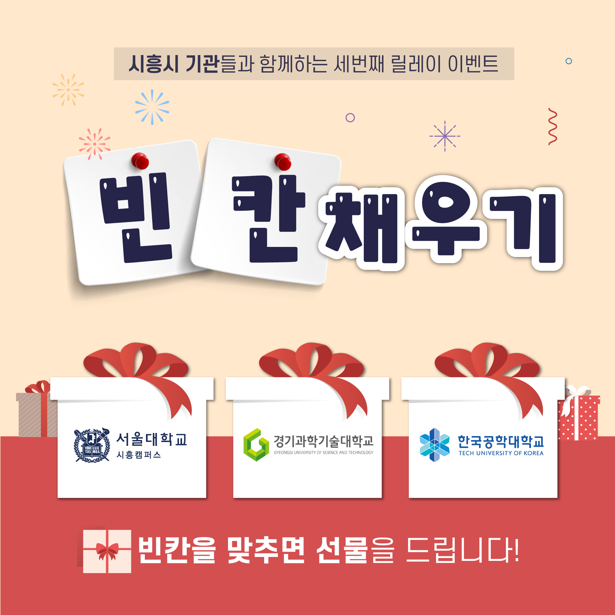 ![]() 수험생 여러분! 지난 수능 모두 고생 많았습니다 이번 릴레이 이벤트는 '교육 도시 시흥! 시흥의 3개 대학'이 함께 합니다. ![]() 도시와 대학은 하나입니다! 수험생 여러분의 앞으로의 새로운 시작을 격려하는 마음을 담아 준비한 이번 이벤트도 많은 관심과 참여 부탁드립니다! [시흥시 기관들과 함께하는 세번째 릴레이 이벤트] 빈칸에 들어갈 단어는 무엇일까요? -기관별 홈페이지를 방문해 가장 핫한 소식을 확인하고 정답을 맞혀보세요! * 푸짐한 선물이 팡팡! * 정답 제출 링크 https://forms.gle/FUvMznnEp1JTRiMX6 * 이벤트 기간 2025. 11. 17.(월) 10:00 ~ 11. 24.(월) 18:00 * 당첨자 발표 2025. 11. 26.(수) 15:00 * 경품 안내 던킨도너츠 모바일 금액권(2만원) - 25명 추첨 * 참여 방법 1. 기관별 배너에서 숨은 단어 찾기! 2. 설문지에 정답 제출하기 ![]() *문제 정답 확인하러 가기! # 서울대학교 시흥캠퍼스 https://siheungcampus.snu.ac.kr/bbs/board.php?bo_table=sub4_2&wr_id=55 # 경기과학기술대학교 https://www.gtec.ac.kr/cms/FrCon/index.do?MENU_ID=2650 # 한국공학대학교 https://www.instagram.com/tukorea_official?utm_source=ig_web_button_share_sheet&igsh=ZDNlZDc0MzIxNw== * 꿀팁! 각 기관별 SNS 팔로우 + 이벤트 게시물 좋아요 하면 당첨 확률이 UP! UP! ![]() 어느덧 마지막을 맞이한 기관 릴레이 이벤트! 앞으로도 좋은 이벤트들이 계속 될 수 있도록 많은 관심과 참여 부탁드려요 |