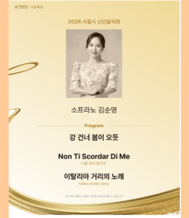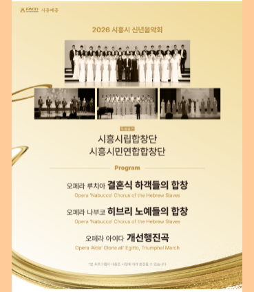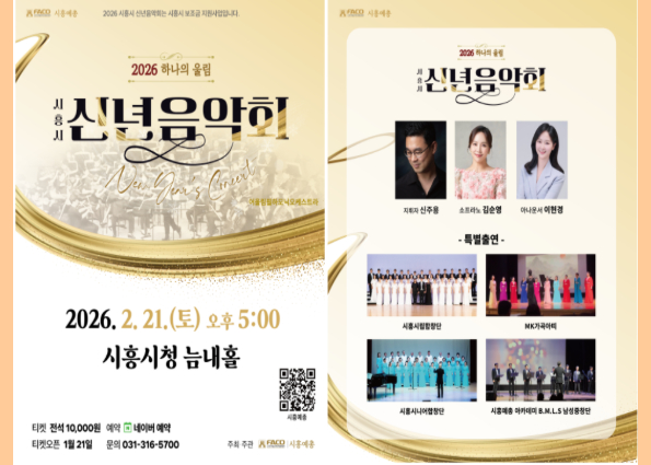 새해의 시작을 알리는 특별한 무대가 펼쳐집니다. 오케스트라와 합창, 성악이 어우러진 풍성한 하모니로 한 해의 첫 순간을 음악으로 채웁니다. 무대 위에서 하나로 이어지는 울림은 희망과 화합의 메시지가 되어 관객에게 전해집니다. 음악이 전하는 따뜻한 시작, 2026년의 첫 감동을 시흥시 신년음악회에서 만나보세요. ![]() ![]() ![]() |