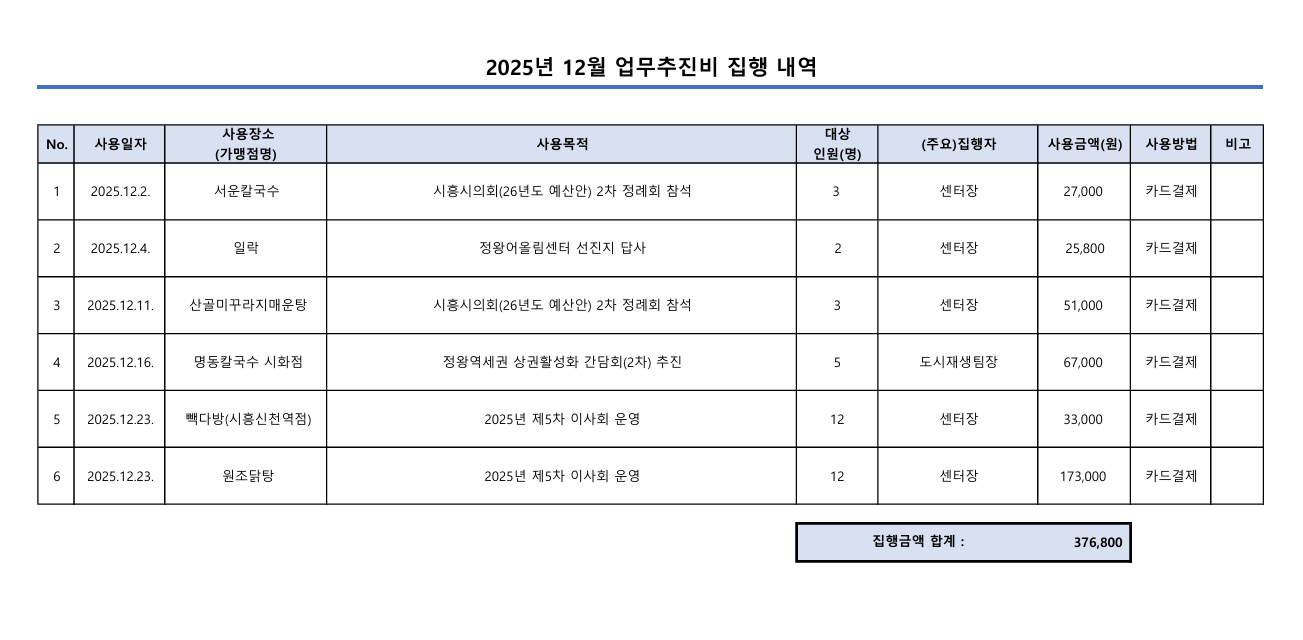[업무추진비] 2025년 12월 업무추진비 내역 공개 [업무추진비] 2025년 12월 업무추진비 내역 공개 본문내용 작성자 : 시흥시도시재생지원센터 작성일 : 2026.01.09 조회 : 37 첨부파일 목록 첨부파일 사업업무추진비(12월).pdf 목록