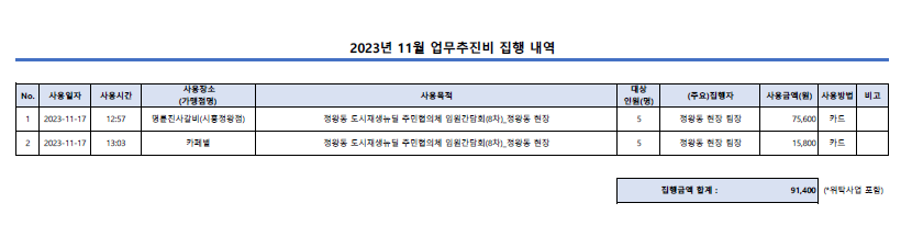 (업무추진비) 11월 업무추진비 내역 공개 (업무추진비) 11월 업무추진비 내역 공개 본문내용 작성자 : 시흥시도시재생지원센터 작성일 : 2024.01.04 조회 : 452 첨부파일 목록 첨부파일 2023년_11월_업무추진비_집행내역.pdf 목록