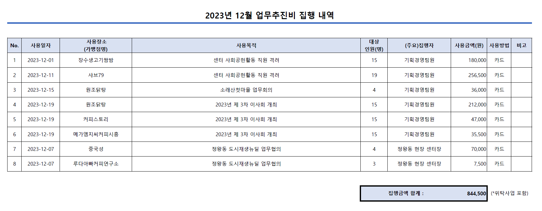 (업무추진비) 12월 업무추진비 내역 공개 (업무추진비) 12월 업무추진비 내역 공개 본문내용 작성자 : 시흥시도시재생지원센터 작성일 : 2024.02.06 조회 : 476 첨부파일 목록 첨부파일 2023년_12월_업무추진비_집행내역.pdf 목록