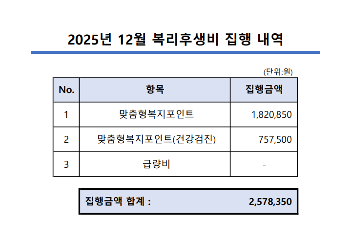 [복리후생비] 2025년 12월 복리후생비 내역 공개 [복리후생비] 2025년 12월 복리후생비 내역 공개 본문내용 작성자 : 시흥시도시재생지원센터 작성일 : 2026.01.09 조회 : 41 첨부파일 목록 첨부파일 12월 복리후생비_집행내역.pdf 목록