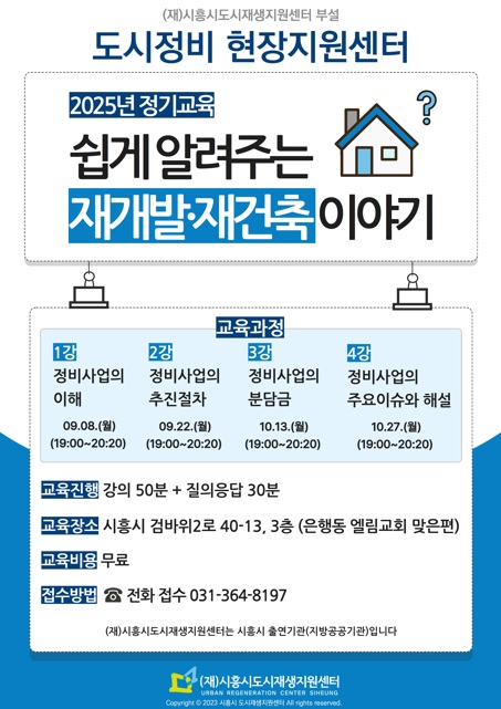 8월 무더위로 인한 휴강을 마치고, 지난 9월 8일 '쉽게 알려주는 재개발 재건축 이야기 교육'이 은행동 도시정비 현장지원센터에서 재개되었습니다. ![]() ![]() '쉽게 알려주는 재개발 재건축 이야기 교육'은 은행동 도시정비 현장지원센터에서 정기적으로 운영되는 교육으로서, 재개발 재건축에 관심이 있는 초심자를 위한 기본 강의입니다. 강의는 총 4강이며, 각 강의는 처음 재개발 재건축 분야를 접하는 시민 분들께서 이해하기 쉽도록 구성하였습니다. 강의 주제는 ‘정비사업의 이해’, ‘정비사업의 추진절차’, ‘정비사업의 분담금’, ‘정비사업의 주요 이슈와 해설’입니다. ![]() 1강 이후에도 전화 및 홈페이지를 통한 상시 접수 가능합니다. ![]() ![]() 소규모 강의로 진행되어 강의에 집중할 수 있고, 질의응답하기 편안한 분위기입니다. 당일 지인 동반 참석 가능하며, 모든 시민 분들의 교육 참여를 환영합니다. ※ 참석 전 미리 교육 신청 바랍니다. ☎ 정기교육 전화 신청/문의 : 031-364-8197 (도시정비팀) 정기교육 인터넷 신청 : https://m.site.naver.com/1QNIy |