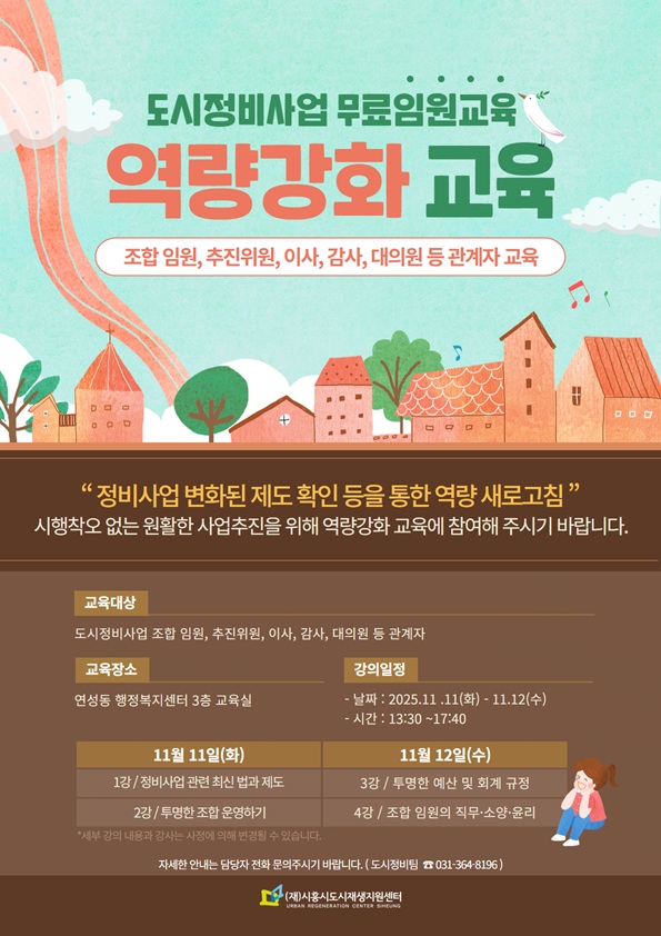 ![]() 시흥시(시장 임병택)와 (재)시흥시도시재생지원센터(센터장 김학민)는 ‘2025 도시정비사업 임원 등 역량강화 교육’을 오는 11월 11일(화)과 11월 12일(수) 이틀에 걸쳐 연성동 행정복지센터 3층 교육실에서 오후 1시 30분부터 하루에 4시간씩 총 8시간 운영한다. 이번 교육은 지난해에 이어 두 번째 추진되는 프로그램으로 도시정비사업에 참여하는 임원 및 관계자의 실무 역량 및 윤리의식을 제고하여 투명하고 원활한 사업 추진 기반을 마련하기 위해 계획되었다. 관내 도시정비사업(재건축, 재개발, 가로주택정비사업 등) 조합 조합장 등 임원 및 대의원, 추진위원회 위원장 및 감사, 추진위원 등 관계자라면 별도의 신청 없이 자유롭게 참여할 수 있다. 본 교육은 도시정비사업 관련 최신 동향, 투명한 조합 운영, 투명한 예산과 회계, 조합 임원의 직무·소양·윤리 등 조합원 신뢰 제고를 위해 꼭 알아야 할 실용 정보를 중심으로 구성됐다. 센터는 도시정비사업 임원 등에 대한 지속적인 교육을 통해 재개발・재건축 등 정비사업의 투명성과 전문성을 강화하여 신속하고 효율적으로 사업이 추진될 수 있기를 기대하고 있다. 도시정비사업 관련 교육에 대한 문의는 (재)시흥시도시재생지원센터 도시정비팀으로 문의하면 된다. ☎ 문의 : (재)시흥시도시재생지원센터 도시정비팀 031-364-8196 |